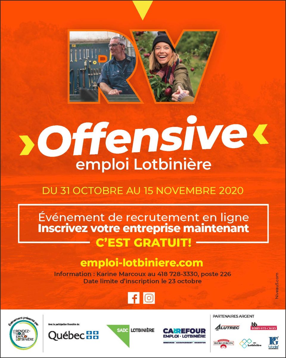 Le Comité offre la possibilité aux employeurs de Lotbinière de s’afficher gratuitement comme étant à la recherche de main-d’œuvre par le biais d’une campagne de promotion qui se déroulera du 31 octobre au 15 novembre 2020.